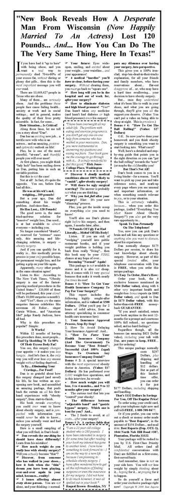 Sample Direct-Response Display AdIf you want to sell a lower-priced service or product directly to your prospects (as opposed to using the 2-step selling formula) from a printed media (like newspapers... magazines... e-zines... or whatever), display ads are the way to go. You must have a good headline though, to get anyone to even look at your ad, and even more important -- your ad must be running in the right place. And ideally, your target market must be passionate about reading the publication you're running your display ads in. Here's what I mean: Let's say you've got a product that helps veterinarians diagnose heartworm. Your product delivers a more accurate diagnosis... it's quicker... and it's cheaper than the testing veterinarians are using now. You could run this ad in some kind of a "Pet" magazine, like Dog Fancy. But... you'll end up making a lot more money running it in Veterinary News. More veterinarians are reading that magazine, and because the information in Veterinary News is more focused, they're reading it more intensely. And how intense... or how much your reader is "hooked" on your advertising medium... Is Critical To The Success Of Your Ad!Chances are, the veterinarians reading Veterinary News are actually looking for ads selling products that'll help their practice run smoother and service their patients better. (Gosh, that sound funny referring to a pet as a "patient", doesn't it?) In fact, using trade or hobbyist magazines is often your very best way of reaching out to your marketplace. Why? Simple. Your ad's a lot more likely to get read. Here, just think about it for a minute: If you're reading "People Magazine", or "Fortune" or "Life", you're not reading all the ads, are you? Nope. But if you go out of your way to subscribe to a trade magazine or a hobbyist magazine, you're either looking to boost your earnings potential or you're excited about learning as much as you possibly can about your hobby. What this boils down to is... How Much Passion You Have!And chances are you're much more passionate about making money and enjoying your hobbies, than you are about People Magazine, right? Of course! When you're reading trade magazines... "niche" group magaines (like, "Architectural Digest" for example)... or hobbyist magazines... you're going to read through every article on each-and-every-page and look at all the headlines in every single ad. Finally, here's your example of a display ad: If you want to download and print out the ad, you'll need the Adobe Acrobat Reader. If you don't have the Adobe Acrobat Reader software, you can get it for FREE by clicking here.