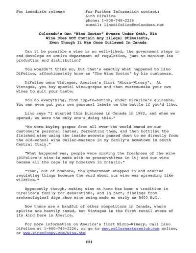 Sample Press ReleasePress releases are great ways of getting "free advertising", usually W-A-A-Y beyond the exposure any one display ad or website could ever generate for you. You see, the thing is... when you're highlighted in the press, you're given "instant" third-party objective credibility. It's almost as as if some "magic" genie has suddenly come along and whisked you away in his magic carpet, sprinkling your name across the minds of thousands... and sometimes hundreds of thousands of people... in the blink of an eye. But... You'd Better Be Prepared!Once you capture the interest of one of the members of the press, you must be ready. If they want to interview you, you'll need to have a Q & A and a Bio. Without these 2 items, you can possibly be missing the opportunity of a lifetime. Your Bio and your Q & A actually give you more control over your interviews, and make the reporter's job much easier (which they enjoy). So make sure you've dotted your i's and crossed your t's before sending out your press releases. Because once your press release hits, you'll probably find... Opportunity won't just be "knocking" at